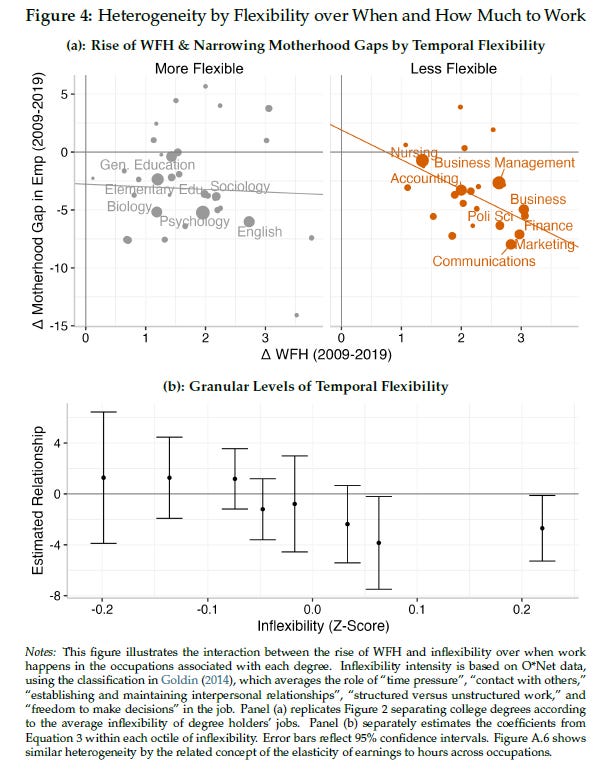 And, having seen this paper, all of the clawing back of locational flexibilities that were introduced during the height of the pandemic looks anti-women, anti-mother, and anti-family. You want bigger families/more babies? You have to solve the work-family conflict and locational flexibilities is a useful tool that is being discarded by the biggest employers, including the federal government. It could also increase the proportion of women that go into high-paying, male-dominated fields, which they get warned away from when they seek out advice, due to work-family conflicts. Women might also have the time and space to participate in parts of the economy that they have had trouble entering, like entrepreneurship, if they have the flexibility that work from home provides.
