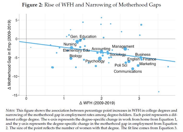 The main results of the paper are shown in Figure 2: those fields that had the largest increases in the work from home rate had the biggest decreases in the motherhood gap in employment, where the gap is comparing mothers to women without children.